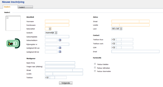Hier kan je de gegevens van de ouders invoeren alsook kiezen wie de betaler en ontvanger van de facturen is. Het is ook mogelijk om de gegevens via EID in te lezen.