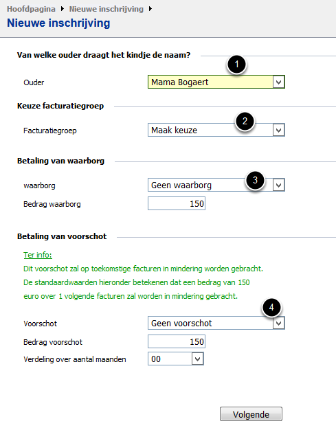 Hier kan je kiezen van welke ouder het kindje de naam draagt (1), je kan het kind koppelen aan de juiste facturatiegroep (2) en eventueel de betaalde waarborg (3) of voorschot (4) invoeren, het voorschot kan verspreid over een x-aantal facturen in mindering worden gebracht.