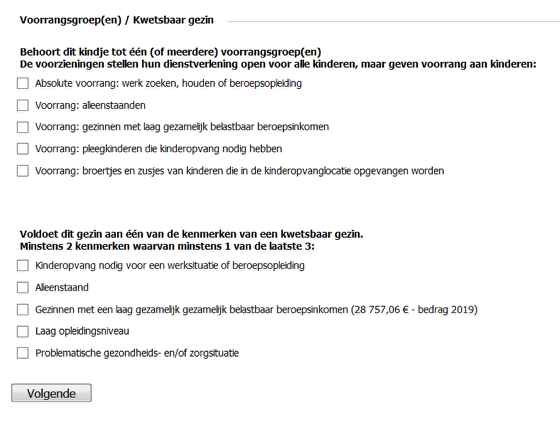 Indien van toepassing voor uw initiatief (IKT) kan u hier de inschrijving toewijzen aan een of meerdere voorrangsgroepen en aanduiden of het gezin voldoet aan de voorwaarden om als kwetsbaar gezin aanschouwd te worden.