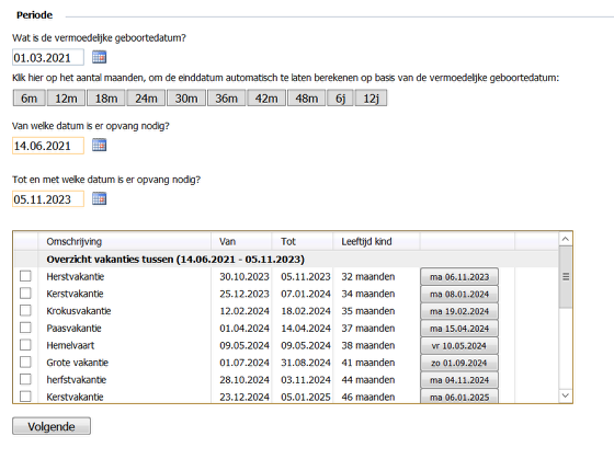 2) klik op een van de knoppen om een aantal maanden bij de ingegeven geboortedatum te rekenen (is de einddatum opvang) . Het systeem zal op basis hiervan ook de instapdatums berekenen.