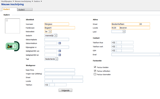 Vul de gegevens van de ouders in. Dit kan manueel of door hun identiteitskaart in te lezen via de Eid software.