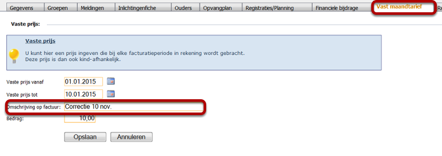 Het tabje vast maandtarief word in principe enkel gebruikt door initiatieven die met vaste maandbedragen werken, maar je kan dit tabje nu ook gebruiken om een andere aanrekening maandelijks of eenmalig op de factuur toe te voegen, in dit voorbeeld voorzien we een correctie van de maand november op de factuur van de maand januari omdat we als periode van 1/01/2015 tot 10/01/2015 hebben gekozen.