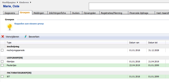 Tip: Zal het kindje vanaf een bepaalde datum aan een andere groep gelinkt moet worden? Bewerk de huidige koppeling dan eerst om een einddatum in te geven.