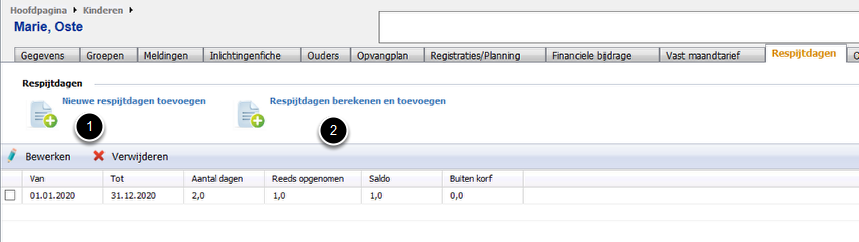 Je kan ervoor kiezen om de respijtdagen manueel in te vullen (1), of je laat de berekening voor de hele opvangperiode door het systeem maken. (2)