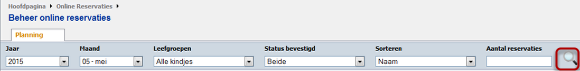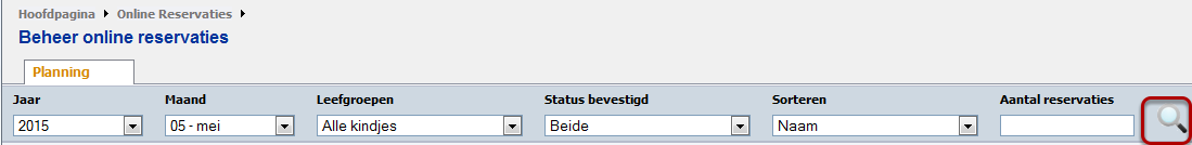 Je kunt de reservaties opvragen door te filteren in de menubalk en daarna te klikken op het vergrootglas.