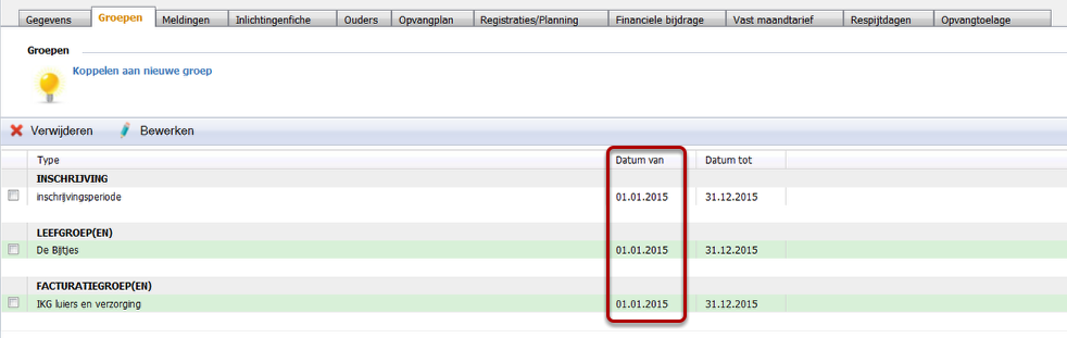 Zorg dat de startdatum van inschrijving en koppelingen aan de groepen starten op de juiste datums in het verleden.