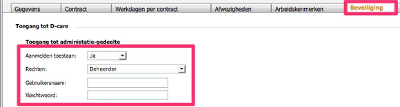 Wanneer één van deze medewerksters wordt ontslagen, kan zij vanop elke locatie met internet aanmelden in d-care dmv de klantcode en het gedeelde wachtwoord.
