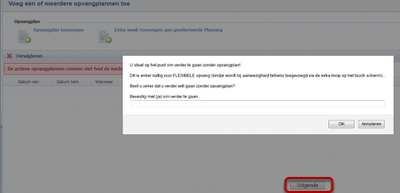 Wanneer je een kind wil inschrijven ZONDER een vast opvangplan kies je meteen "volgende" en zal je een melding krijgen, u dient dan "ja" te typen, pas dan kan u verder, een berekening van de mogelijkheid of er plaats is wordt dan overgeslagen.