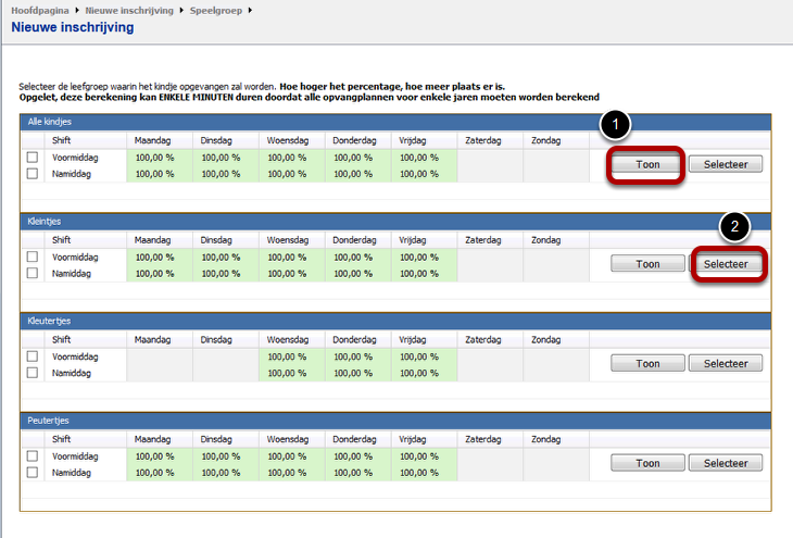 2: Als je op SELECTEER klikt, dan zal deze leefgroep voor dit kind geselecteerd worden. het kind wordt hier dan automatisch aan gekoppeld.