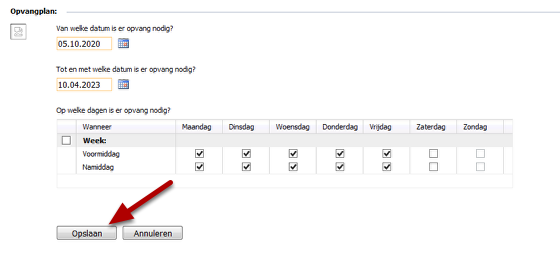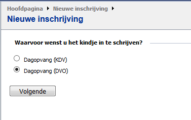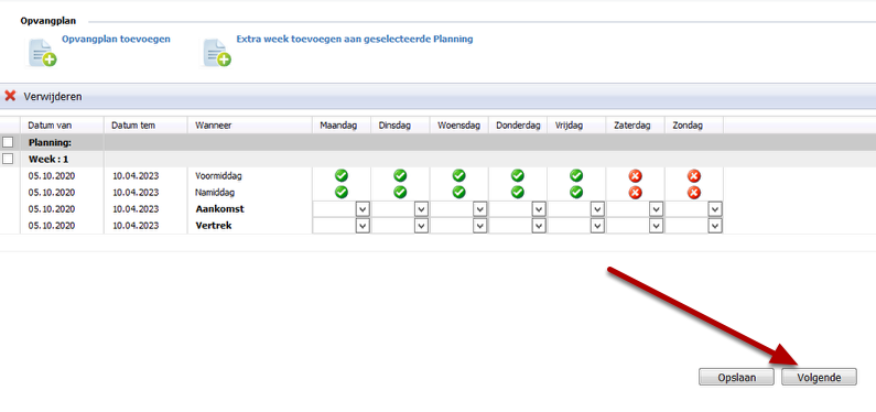 Het ingegeven opvangplan wordt nog eens getoond en u kan op 'volgende' klikken om verder te gaan.