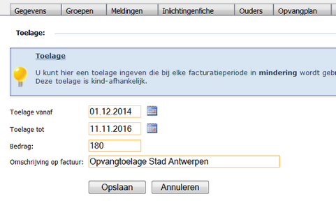 Deze functie is enkel van nut voor kinderdagverblijven met toestemming van de stad Antwerpen of indien het lokale bestuur beslist om op een gelijkaardige systeem een toelage te voorzien