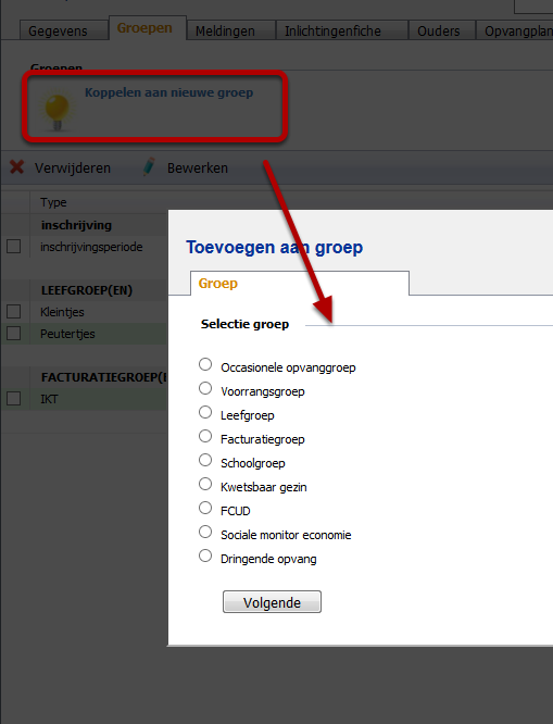 Tip: Zal het kindje vanaf een bepaalde datum aan een andere groep gelinkt moet worden? Bewerk de huidige koppeling dan eerst om een einddatum in te geven.