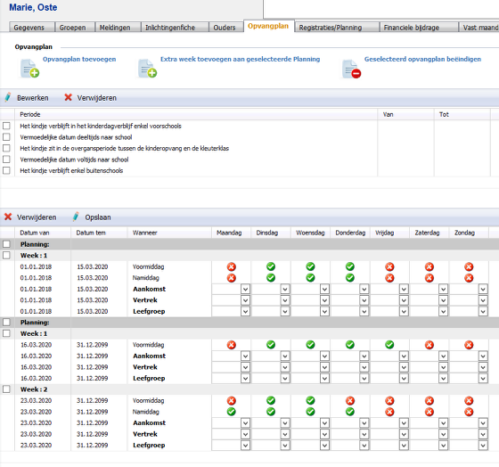 Bij registraties / planning kan je terugvinden hoe het kindje in het verleden opgevangen werd en hoe het nog zal komen in de toekomst.