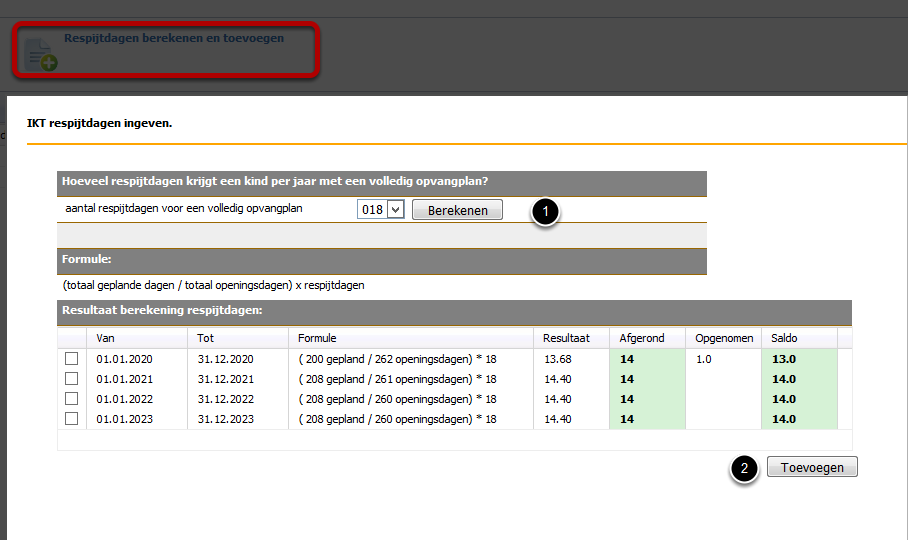 Je kan ervoor kiezen om de respijtdagen manueel in te vullen (1), of je laat de berekening voor de hele opvangperiode door het systeem maken. (2)