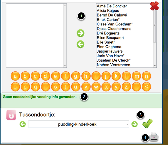 1)selecteer kindjes 2)je krijgt een melding indien er kinderen een specifieke voedingsgewoonte of allergieën hebben (ingevuld in de inlichtingsfiche) 3)selecteer het gerecht 4)druk het lijstje af. het is ook mogelijk om eerst enkele kinderen te selecteren, een gerecht of type gerecht te kiezen, dit te bevestigen met de groene V, daarna andere kinderen selecteren en voor hen een ander gerecht te kiezen, zo kan u op 1 lijst verschillende kinderen zetten met verschillenede maaltijden.