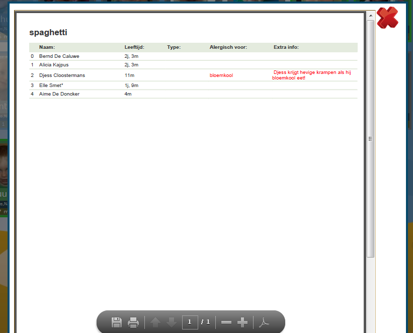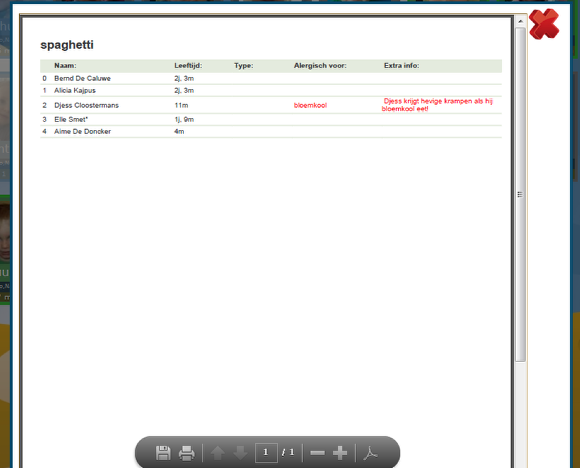 Op het lijstje worden ook de leeftijd van het kind en allergieen die u in de inlichtinsfiche heeft genoteerd vermeld.